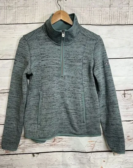 This Kuhl Women's Ascendyr 1/4 Zip Pullover is a versatile and stylish addition to your wardrobe. With a mock neck and casual sleeve type, it's perfect for any occasion, whether you're going for a casual look or outdoor activity. The 1/4 zip closure and elastic cuff and waistband provide comfort and convenience, while the zippered hand pockets add practicality. The soft fleece fabric is perfect for any season, whether it's winter, summer, fall, or spring. It's machine washable, making it easy to care for. The green mottled pattern adds a touch of uniqueness to the design. This product is a great choice for anyone who loves outdoor activities and wants to stay comfortable while looking stylish. Measurements chest pit to pit 19 inches 23 inches in length