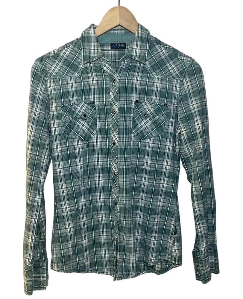 Kuhl Ionik button down shirt, size small. Teal and white plaid pattern. Two front pockets and curved... Show more