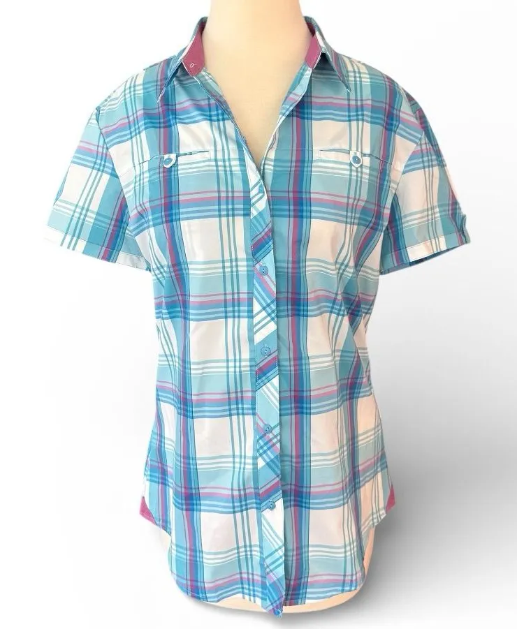 Kuhl short-sleeve performance shirt. The lightweight fabric is moisture-wicking and quick-drying, making it perfect for hiking, travel, or camping. • New without tags. No damage or flaws • Blue, Purple, and White Plaid with Dark Purple contrast trim inside collar and at hem. • Two chest pockets with button closures, signature Kuhl embroidery on the back yoke, and a feminine, slightly tapered fit. • Material: 100% Polyester (Quick-dry / Breathable). Measurements (Taken with garment laying flat as shown in photos) • Chest (Pit to Pit): ~19 inches • Length (Shoulder to Hem): ~26 inches Purchases mailed next business day 🌸 Keywords: Kuhl, hiking shirt, plaid, button down, pearl snaps, moisture wicking, quick dry, outdoor apparel, camping, travel, gorpcore, performance wear, technical shirt, summer top, activewear, western, utility, breathable, mountain culture, trail ready, purple plaid, blue plaid, women's outdoor gear.