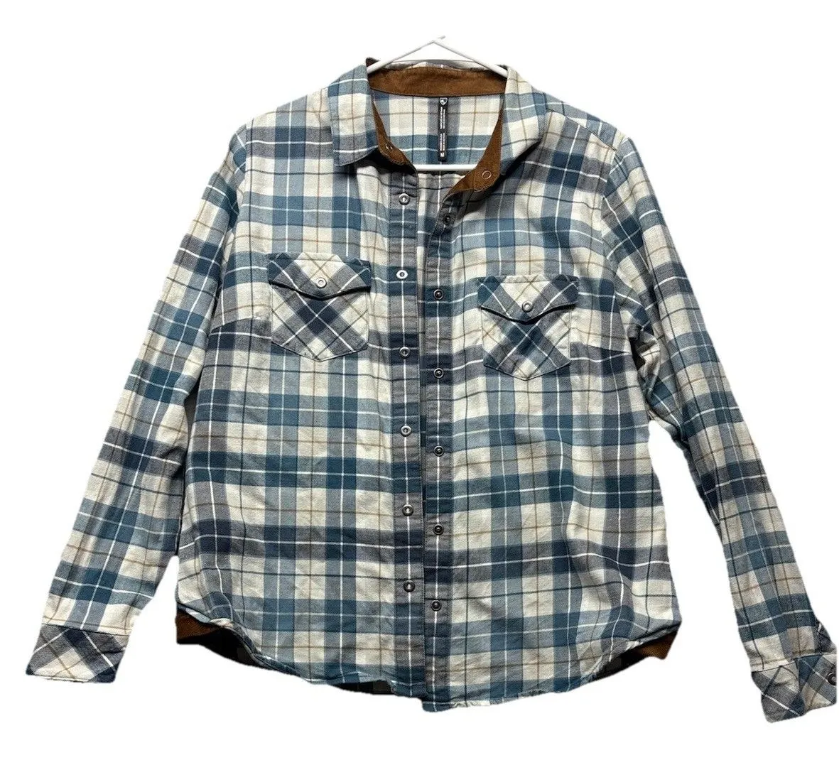 The Kuhl Women's Shirt is a stylish and versatile flannel shirt perfect for outdoor activities like camping and hiking. Made from a blend of Tencel and cotton, this medium-sized shirt features a classic blue plaid pattern with long sleeves and a snap closure. The Kuhl brand is known for its quality and outdoor-themed designs, making this shirt an ideal choice for women who love nature and a classic, gorpcore style. Perfect for layering or wearing on its own, this button-up shirt is a timeless addition to any wardrobe.