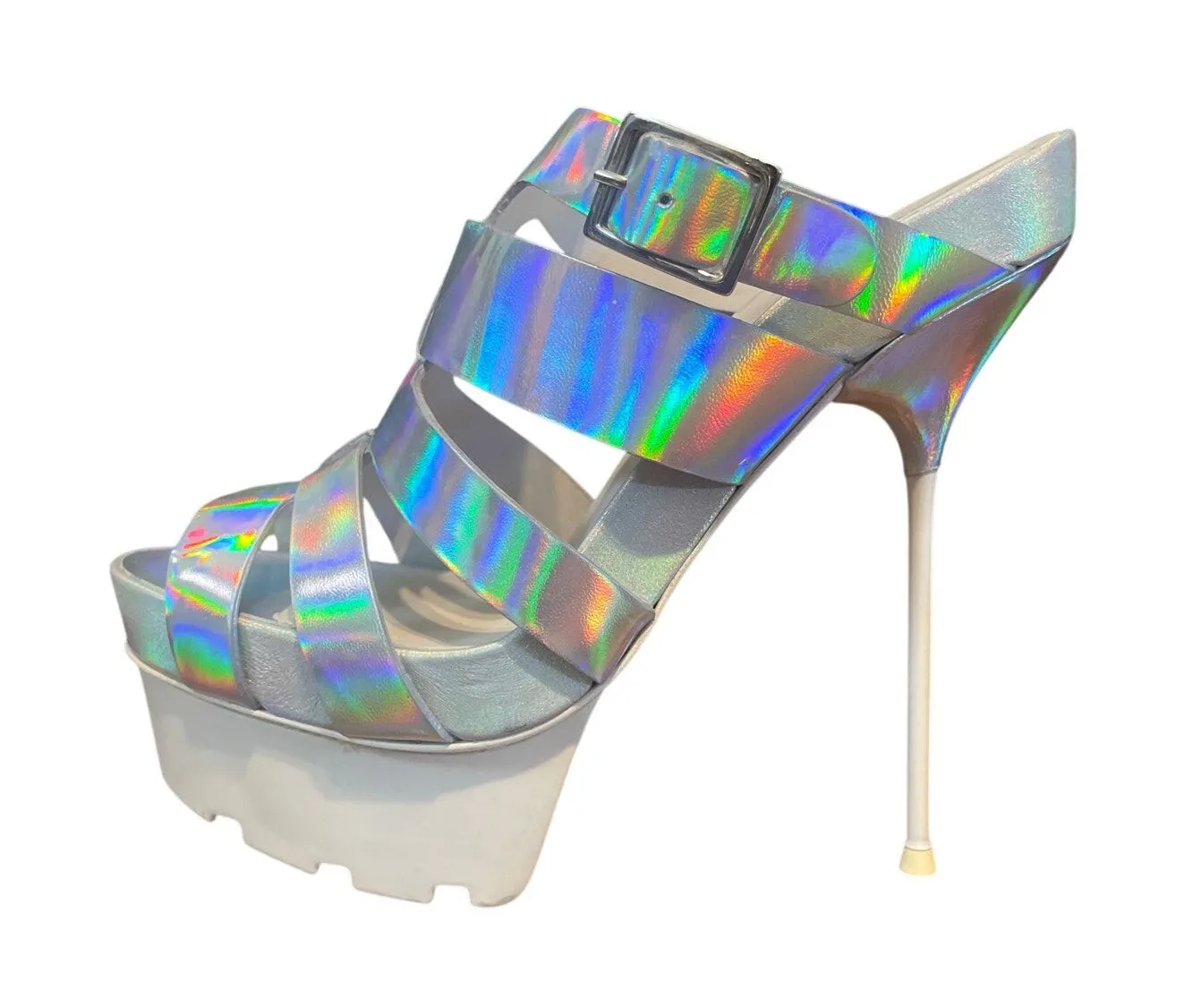 KURT GEIGER i win SEXY Lug Sole Platforms in Silver Metallic silver leather with white stiletto heel and platform Super skinny heel Strappy with buckle Size 39 (US size 8.5 to 9 approx) New with box and dust bag tags: designer, indie sleaze, high heel, party, cocktail, spring, summer, cyber girl, rave, futuristic, holiday, vacation, cruise, 111220 SUSAN