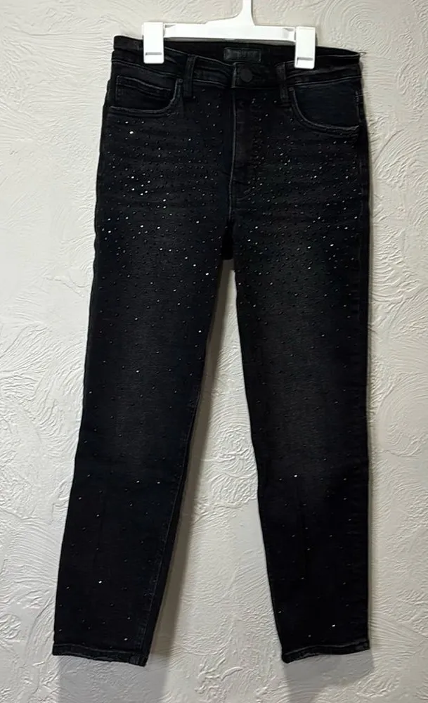High-rise Embellished rhinestone bling Black with a faded wash Size 4 Rise 10” Inseam 25” Waist 14... Show more
