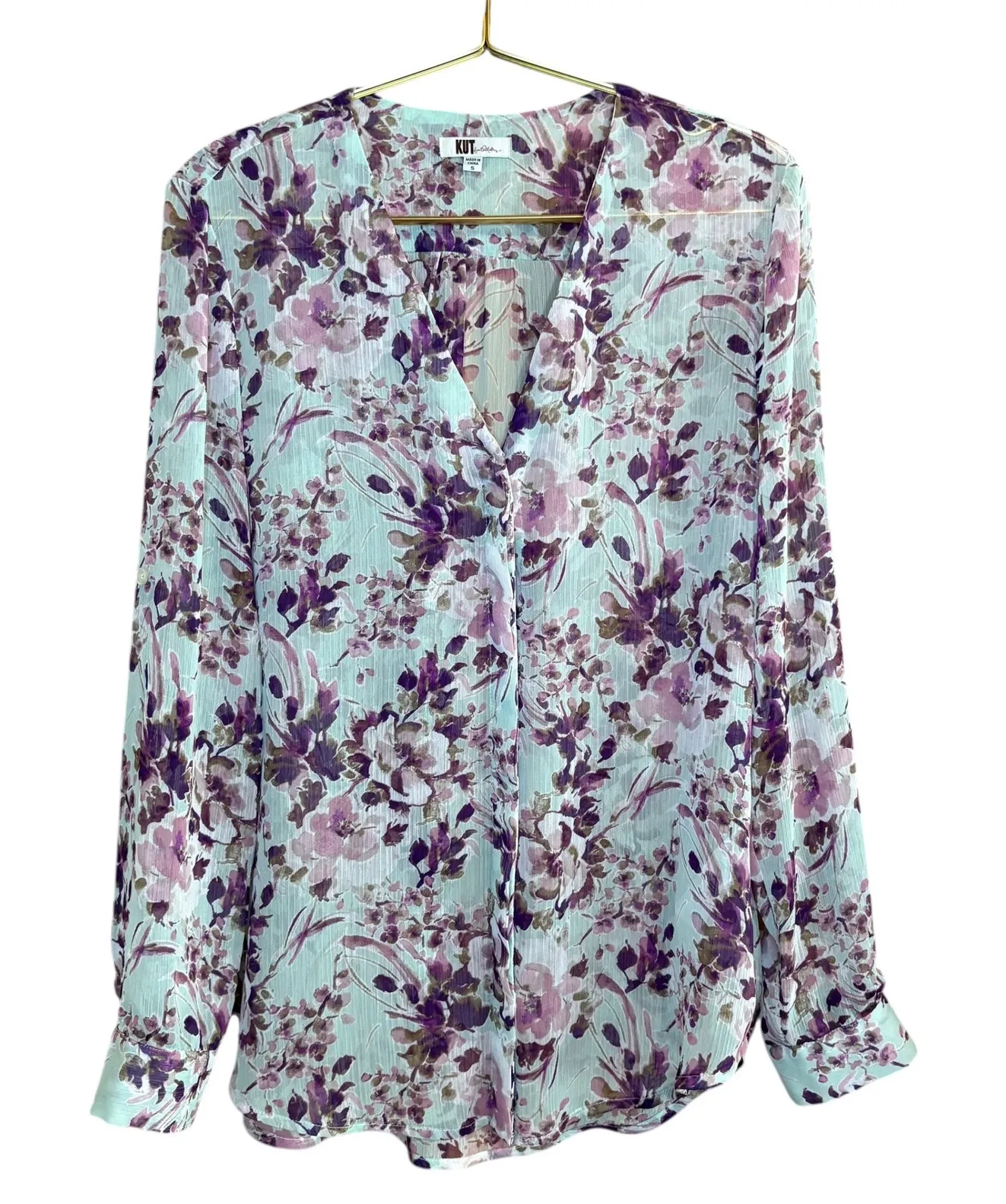 Cascading florals define this sheer, ethereal Kut from the Kloth size small blouse, perfect for adding a touch of romance to any ensemble. Crafted with meticulous attention to detail, this lightweight blouse features a flattering v-neckline that elongates the silhouette, and a button-down front for versatile styling. The long sleeves add an elegant touch, making it ideal for both daytime events and evening gatherings. Imagine pairing it with tailored trousers for a polished office look, or dressing it down with jeans for a chic weekend outing. Perfect for garden parties, brunch dates, or any occasion where you want to exude effortless sophistication.