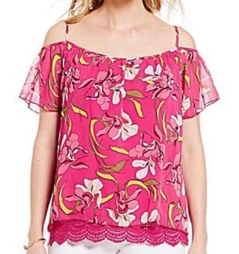Kut from the Kloth Pink Tropical Floral Cold Shoulder Blouse with lace trim, size small. Excellent u... Show more