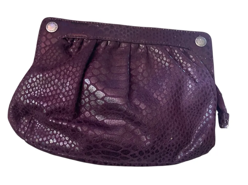 This elegant wristlet features a deep purple hue and a textured, leather-like material with a shimme... Show more