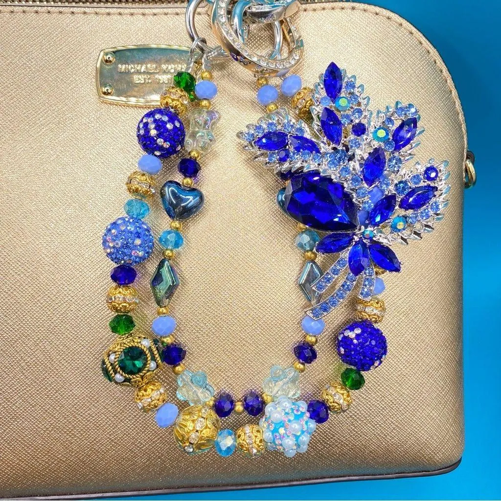 β¨LIMITED EDITION, ONLY 2 AVAILABLEβ¨ π Handmade Luxury Double-Layer Bling Purse/Bag Chain/Keychain/Key Ring/Phone Chain or Charm Accessory Jewelry With Beautiful Large Rich Blue Rhinestone Floral Bouquet Brooch & Fancy Crystal and Handmade Clay Beads Beyond stunning, more gorgeous in person. Can be used as a keychain, phone chain, bag chain (my favorite) or clothes chainβwear on your jeans or pants by attaching to belt loopsβso cute! Gorgeous, fun wearable art. Can be separated into two chains. Each piece is handmade. Beautiful luxury quality and sparkle. Truly special! πΈβ¨ Makes a lovely and unique gift for you or anyone special in your life. Flowers that last forever :)). Super gorgeous and a fun way to add a little bling to anyoneβs style! πΈβ¨ Included (all shown) π Elegant 3D floating gift box π Black velvet pouch for storage π Phone case lanyard π Pair of smaller rings, choose silver or gold π Pair of large rhinestone rings (for wearing on bags especially), choose silver or gold Approx. Dimensions Total length (excluding rings): 12β Floral Brooch: 2.5β x 3.5β πΈSearch my closet for other cute accessory listingsπΈ π‘ Pet-free/smoke-free home. Gift, Keychain, Key Ring, Phone Accessory, Bag/Handbag/Purse/Backpack Chain Charm, Jewelry, Glittery, Sparkly, Bling, Blingy, Shiny, Luxe, Luxury, Fancy, Bougie, Classy, Pretty, Beautiful, Wristlet, Bracelet, Strap, Rhinestones, Handmade Clay Beads