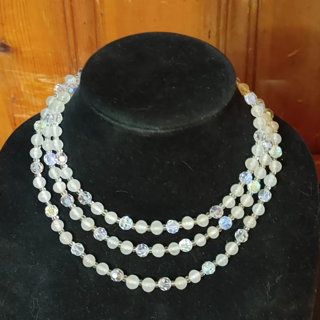 This exquisite vintage necklace exudes timeless elegance with its sparkling crystal and faux pearl beads. The multi-strand design creates a graceful silhouette, reminiscent of bygone eras, making it a captivating statement piece for those who appreciate classic beauty and sophistication. • Three-strand design • Lobster clasp closure • Approx. length: 12 inches • Lightweight Just a quick note, Items are cleaned / sanitized using ozone treatment prior to shipping they may have light cleansing smell. Keep in mind that the majority of my listings consist of second-hand products. Therefore it is advisable to inquire about any details before making a purchase. I respond quickly to your questions feel free to make offers. "Always Be Kind to Each Other". Jewelry Note: Presidium Duo Tester II method DOES NOT distinguish between Real & Lab created stones.