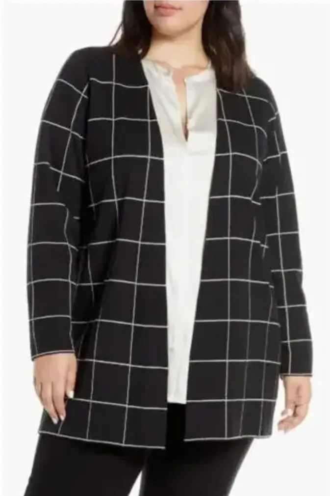 Eileen Fisher Cardigan Sweater Womens Size 2X Black Wool Windowpane Check Open Front Excellent pre-... Show more