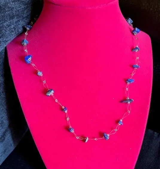 Vibrant blue Lapis stone chip choke | necklace. Beaded individually on clear silicone strands, with tiny glass bead accents. 18” total length. Barrel closure It is considered to be a protection from psychic attacks, bringing deep peace, harmony, reveals inner truth, honesty, compassion, self - awareness, and self - expression. Because of its healing powers, Lapis lazuli is celebrated as being The Wisdom Stone. Having its classic type, it is being loved by the pharaohs from Egypt thousands of years back. Lapis Lazuli crystal welcomes most of the truth, wisdom, and spiritual wonder and makes it into your inner peace.