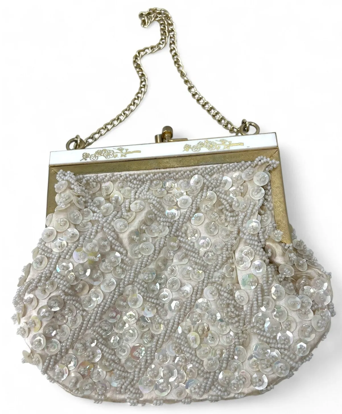 PROJECT PURSE - 1950s white vintage seed bead and sequin purse / vintage white purse / 1950s beaded purse / white and gold sequin purse pprox. 6" x 6" opening of the purse is approx. 5" x 3.5" circa 1950s/60s beautiful clasp details and sequin + beadwork