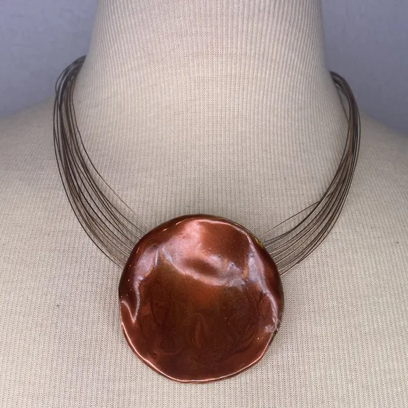 Chico’s copper disc wavy enamel pendant with thin multistrand silver-tone & brass-tone wire chain. L... Show more