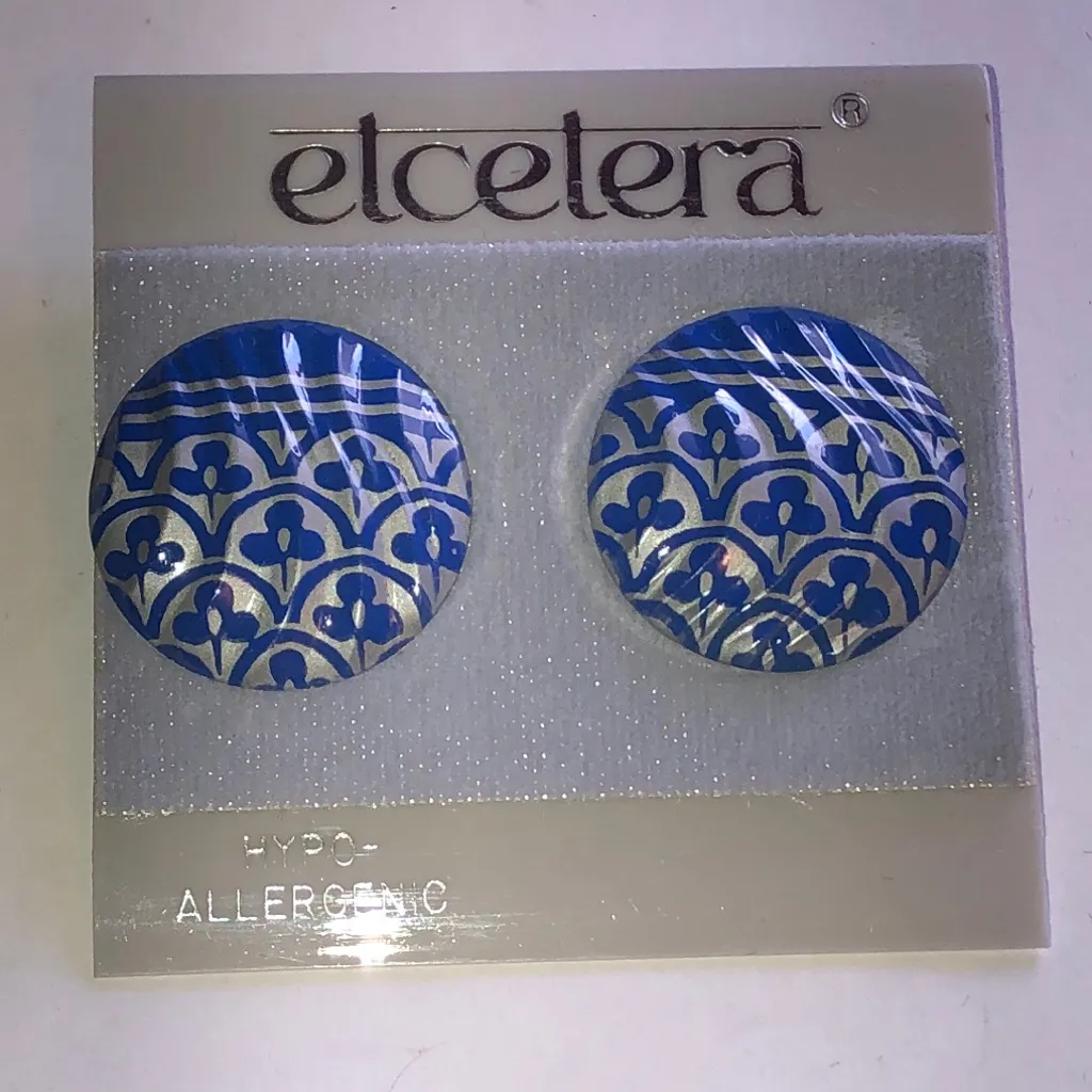 Stylish blue patterned earrings by Etcetera. Hypoallergenic design. New Approximately 1.10” A8 Boho Vintage Street Style Minimalist Statement Piece Essential Trendy Fashion Forward Must-Have On-Trend Cute Casual Edgy Classic Rare Find retro mid century modern estate jewelry costume jewelry