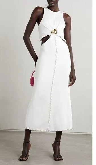 ET OCHS Laela embellished cutout stretch-satin jersey midi dress sz 6 Color is off white / cream NEW WITH TAG Retail $1495 Dress Stretch-satin jersey Cutout Detachable brooch Concealed hook and zip fastening at back Partially lined Mid-weight, stretchy fabric Dry clean Imported 96% Viscose 4% Elastane The Et Ochs evening wear is a combination of fluid stretch-satin jersey, bold cutouts, gold-tone floral embellishments, and delicate ruffled lettuce trims make it a show-stopper. The slim fit ensures it flatters the silhouette beautifully. Measurements are approximate Please expect wrinkles from Storage !! tags: fall, autumn, winter, cool weather, boho, bohemian, mini, tiered, ruffle, fit & flare, long sleeve, date night, night out, event, evening, special occasion, cocktail, dinner, career, business, work, workwear, professional, fashion, fashionable, trendy, wedding, bride, trendsetter, ootd