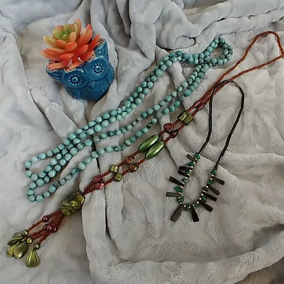 Bundle of 3 Vintage necklaces Estate jewelry Turquoise blue seed necklace measures about 30" Amber... Show more