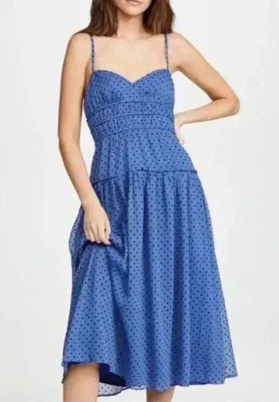 Gorgeous La Maison Talulah Sorrento blue polka dot midi /sundress. In great condition. Lightweight georgette and delicate polka dots bring an air of romance to this La Maison Talulah dress. Label says size Medium. However I believe this dress runs much smaller and would better fit a size small-medium. See demonstrations below. - 100% polyester - No stretch - Sleeveless - Adjustable straps - Hidden back zipper - Fully lined - Sweetheart neckline Length: 39 inches Width: 13 inches Waist: 18 inches