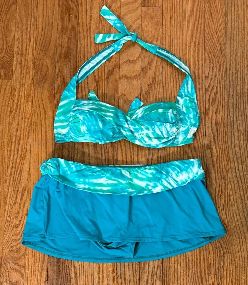 Excellent used condition La Blanca by Rod Beatte Halter Top- tie closure sweatheart neckline Skirt bottom with built in briefs retro modest beach beachy bathing suit swimsuit bikini set spring break summer vacation tropical cruise resort