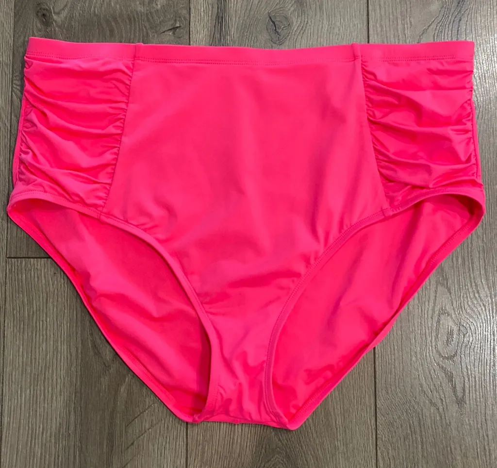 La Blanca High Waist Ruched Pink Swim Bottoms Size 20W. There is some faint color transverse stains on the front inside lining. See last two pictures. No staining on outside. Otherwise an excellent! Flattering side ruching. See pictures for measurements