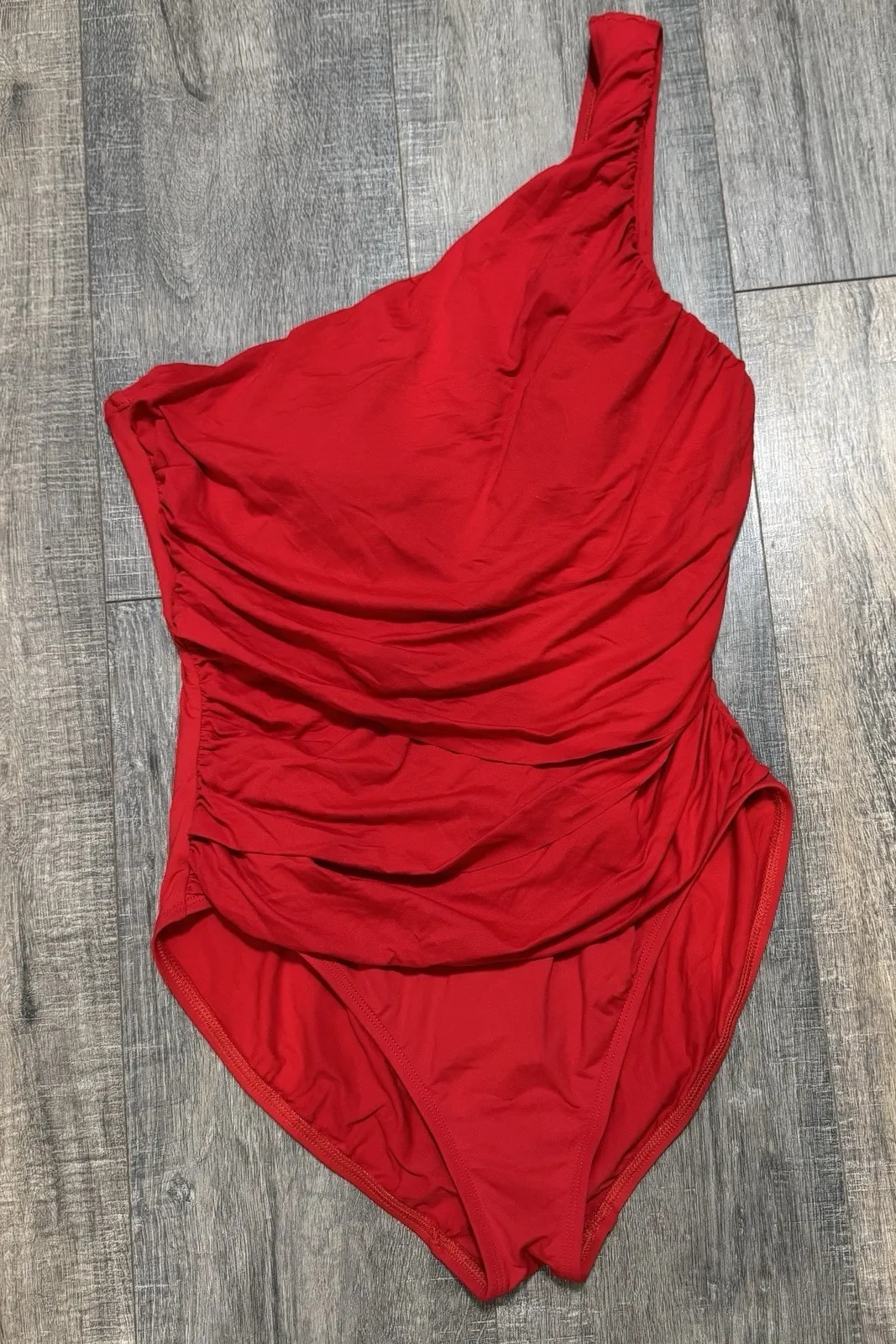 The La Blanca One Piece One Shoulder Red Ruched Swimsuit in Size 12 is a stylish and slimming option... Show more
