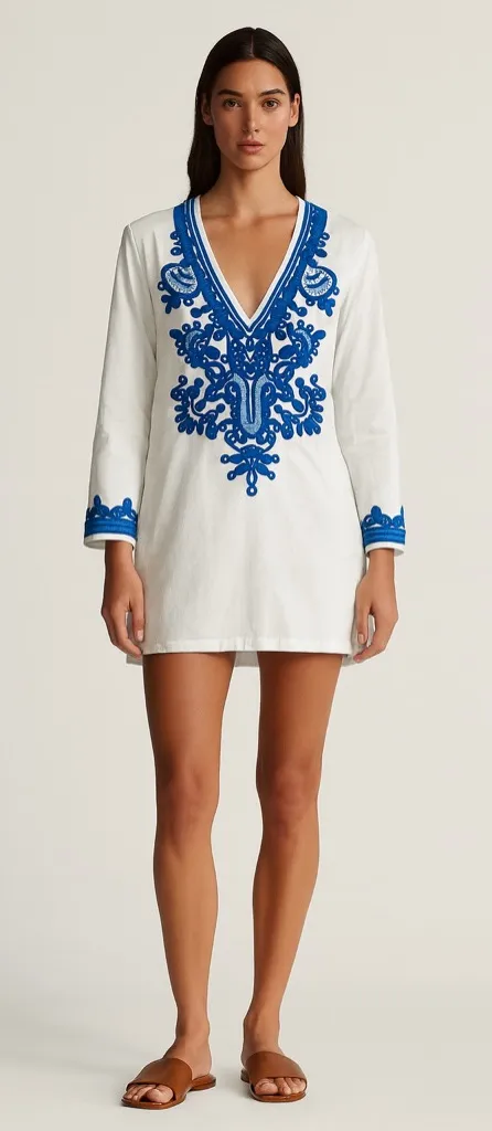 La Blanca white tunic swim cover with blue embroidery at cuffs add split neck. S - $32 - From Ann