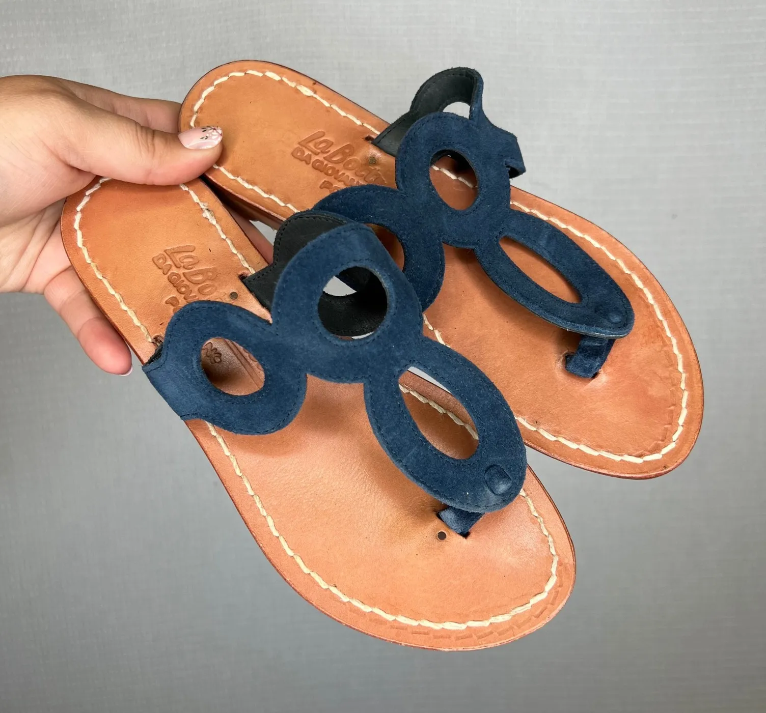 Unique thong sandals exuding Italian craftsmanship. Featuring a tan leather footbed, these sandals are distinguished by a striking blue suede strap design composed of interconnected circles and teardrop shapes, adding a touch of modern flair to the classic thong silhouette. The leather soles are marked with 'Vero Cuoio Made in Italy,' attesting to the quality of the materials and the artisanal construction. Style: Thong Upper Material: Suede Features: Comfort, Handmade, European Style, Lightweight, Cushioned Character: Bohemian, Italian, European Type: Sandal Model: Positano Keywords: La Botte Gardian, Positano, Italy, Leather Sandals, Thong Sandals, Blue Suede, Size 7, Designer Sandals, Italian Shoes, Summer Sandals, Vero Cuoio, Handmade Sandals, Comfortable Sandals, Bohemian Sandals