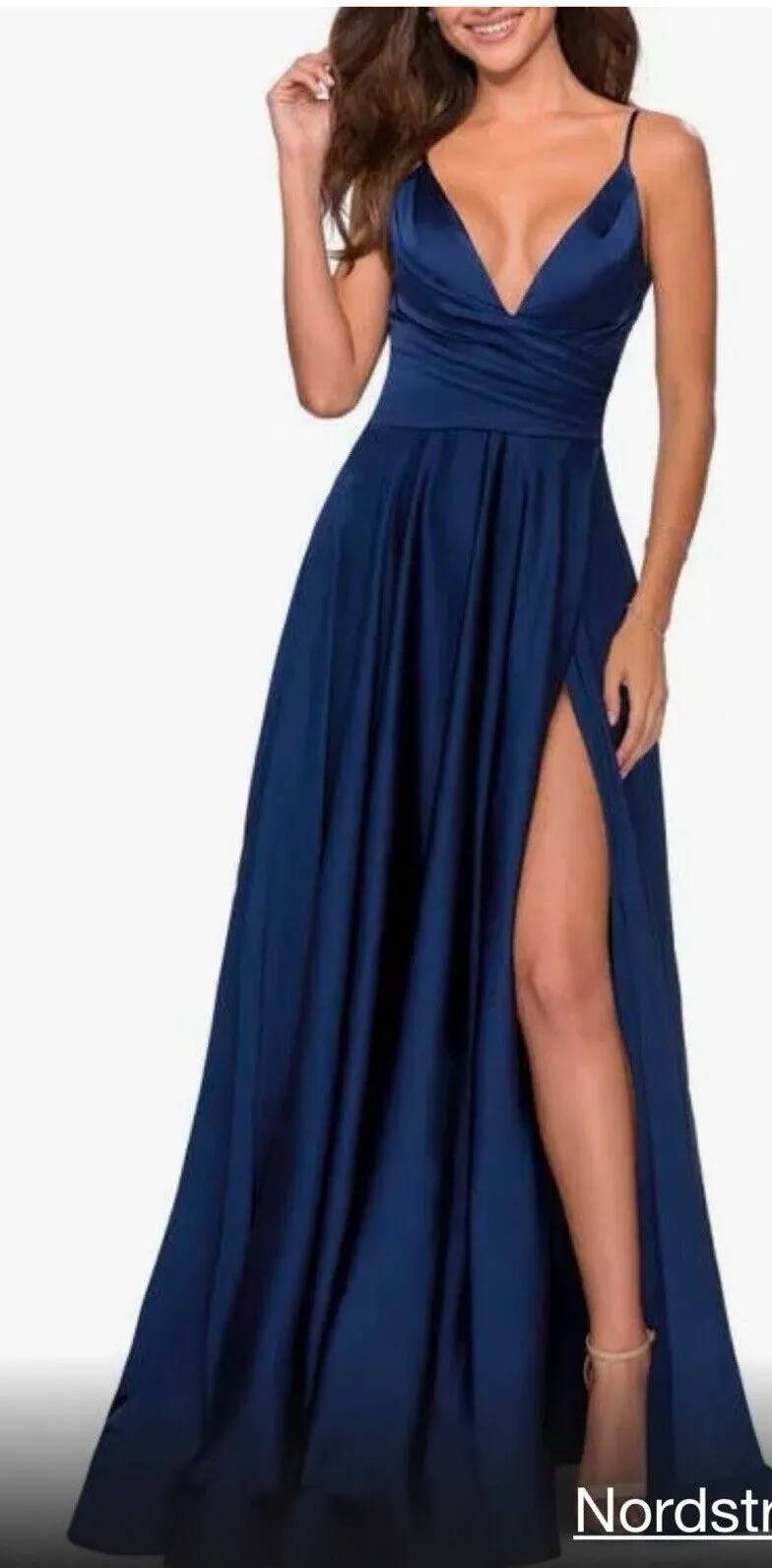 Look stunning in this elegant La Femme dress. The dress features a faux wrap style with a high slit... Show more