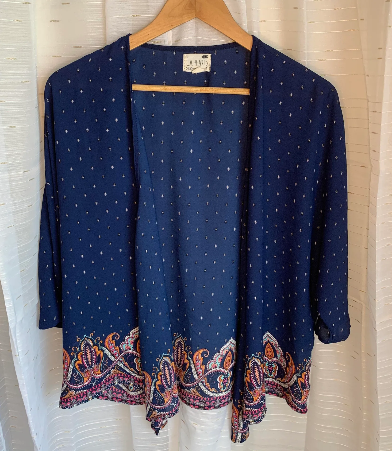 Lightweight kimono with a colorful print along the bottom. Gently used. Item #92087