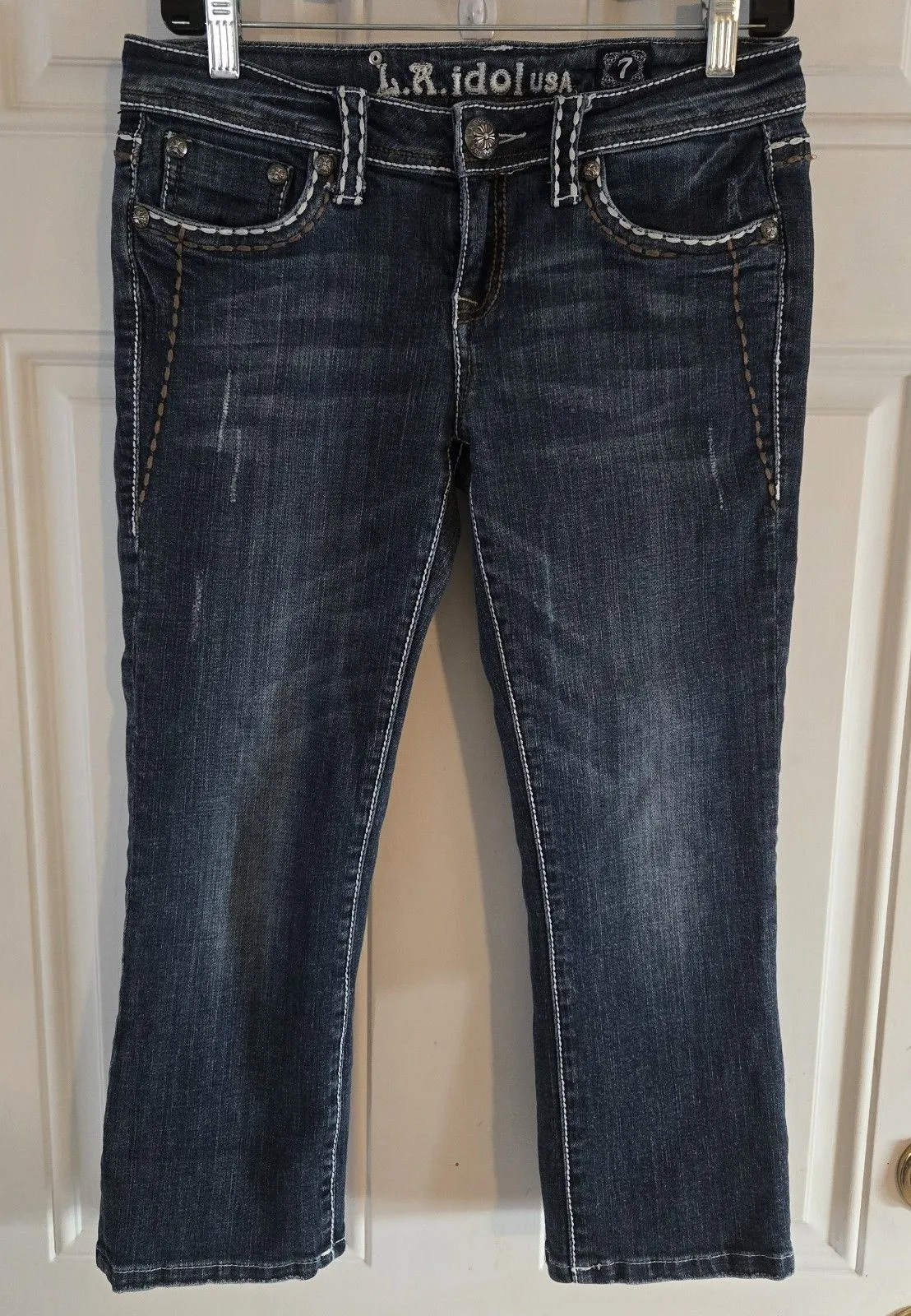 L.A. Idol USA junior capri jeans are a classic Y2K-inspired denim staple with eye-catching contrast stitching and signature embellished back pockets. Tag size is junior 7, with a measured waist of 30 inches, rise of 7.5 inches, and inseam of 22 inches for a true capri length.