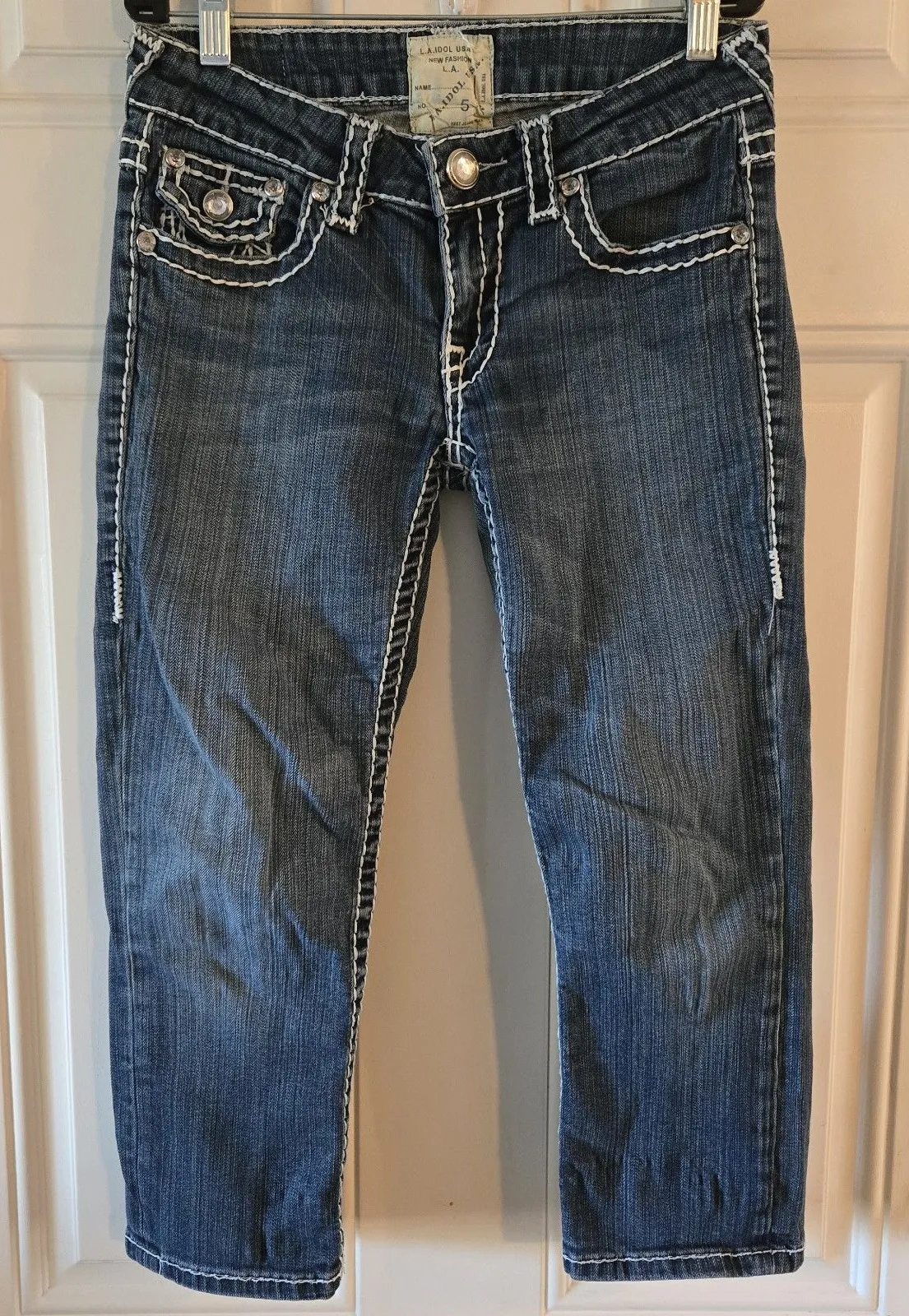 LA Idol USA Womens cropped Jeans, size 5, featuring signature bling rhinestone flap pockets, contrast white stitching. These jeans have a classic Y2K western-inspired look that pairs perfectly with boots or heels for casual or night-out outfits. Capri denim. Approximate measurements flat lay Inseam 20" Rise 7" Waist 27" L.A. Idol USA, embellished jeans, rhinestone jeans, western bling denim, Y2K jeans, bootcut jeans, rock revival style, cowgirl jeans, boutique denim, trendy stretch jeans, Miss Me style