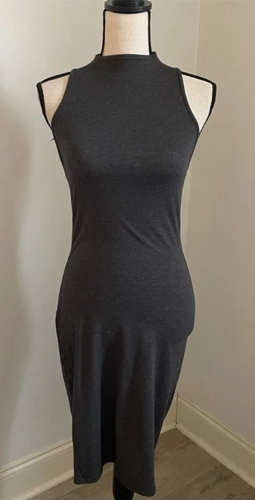 Measurements: 15” pit to pit, 37” shoulder to hem Material: polyester, spandex - made in USA Condition: Excellent Preowned Condition Style Tag: #classic #preppy #staple #timeless #evergreen #modern #wardrobestaple #minimalist #oldmoney #scandinavian #quietluxury #neutral #closetstaple #elegant #refined #quality #eurosummer #normcore LA Made Mock Neck Dress size Small Gray Sleeveless Halter Bodycon Minimal Sheath
