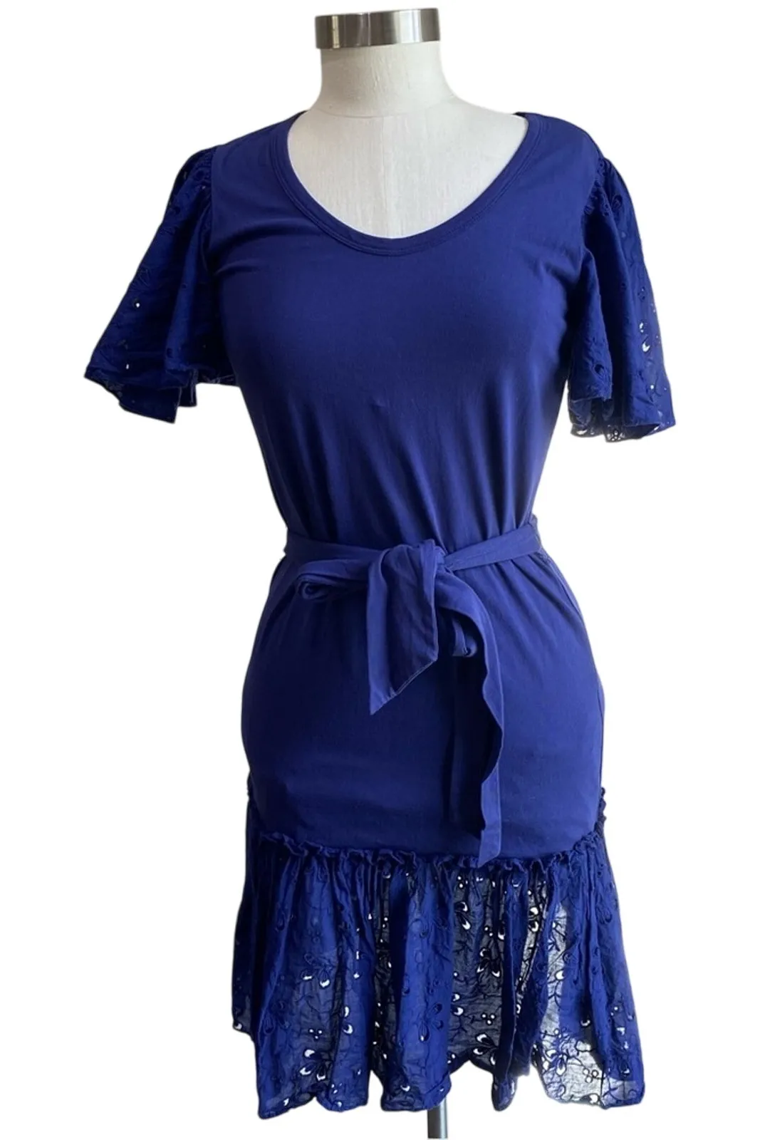 La Vie by Rebecca Taylor blue cotton dress featuring embroidered eyelet flutter sleeves and a tiered flounce hem. Comes with a matching waist tie for a flattering fit. Perfect blend of casual and feminine — ideal for brunch, vacation, or spring events. Measurements (approx.): Bust: 17 inches Length: 37.5 inches Size: XS Condition: Great pre-owned condition. From a smoke-free, pet-free home. Keywords: Rebecca Taylor, La Vie, blue cotton dress, eyelet ruffle sleeve, flounce hem, spring summer dress, boho feminine, casual chic, resort style, size XS ::RR