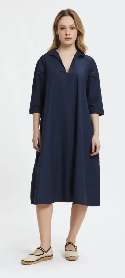 Retails for $275 Excellent Condition - no flaws or stain Designer Size 2 = Universal Size Medium Stunning Italian poplin cotton midi dress in black - perfect for the office, dinner dates, weekend fun, and everything in between. Features: Lightweight Three Quarter Sleeve V Neckline Midi Length Relaxed Fit Flowy Style Italian made 100% Cotton Machine wash gentle Approximate Measurements - laid flat / no stretch: Bust: 44” / armpit to armpit: 22” Length: 44”