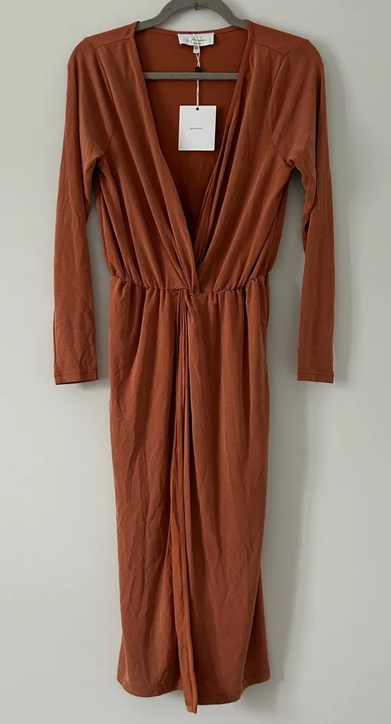 L’ Academie The Judy Dress Terracotta New with tags Size Small Colors Brown Waistband is elastic and has generous stretch Draped front Mini skirt lining underneath Fabric in general has generous stretch Long sleeve Fitted dress 68% modal, 32% poly Hand wash cold Unlined Surplice front Ruched overlay Midi length Revolve Style No. LCDE-WD365 0106