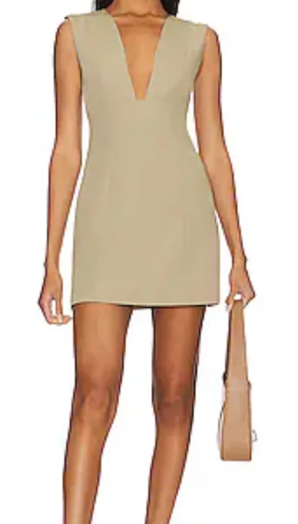 Brand new with tags never worn. Gorgeous khaki colored chic mini dress with v-neck front and back. G... Show more