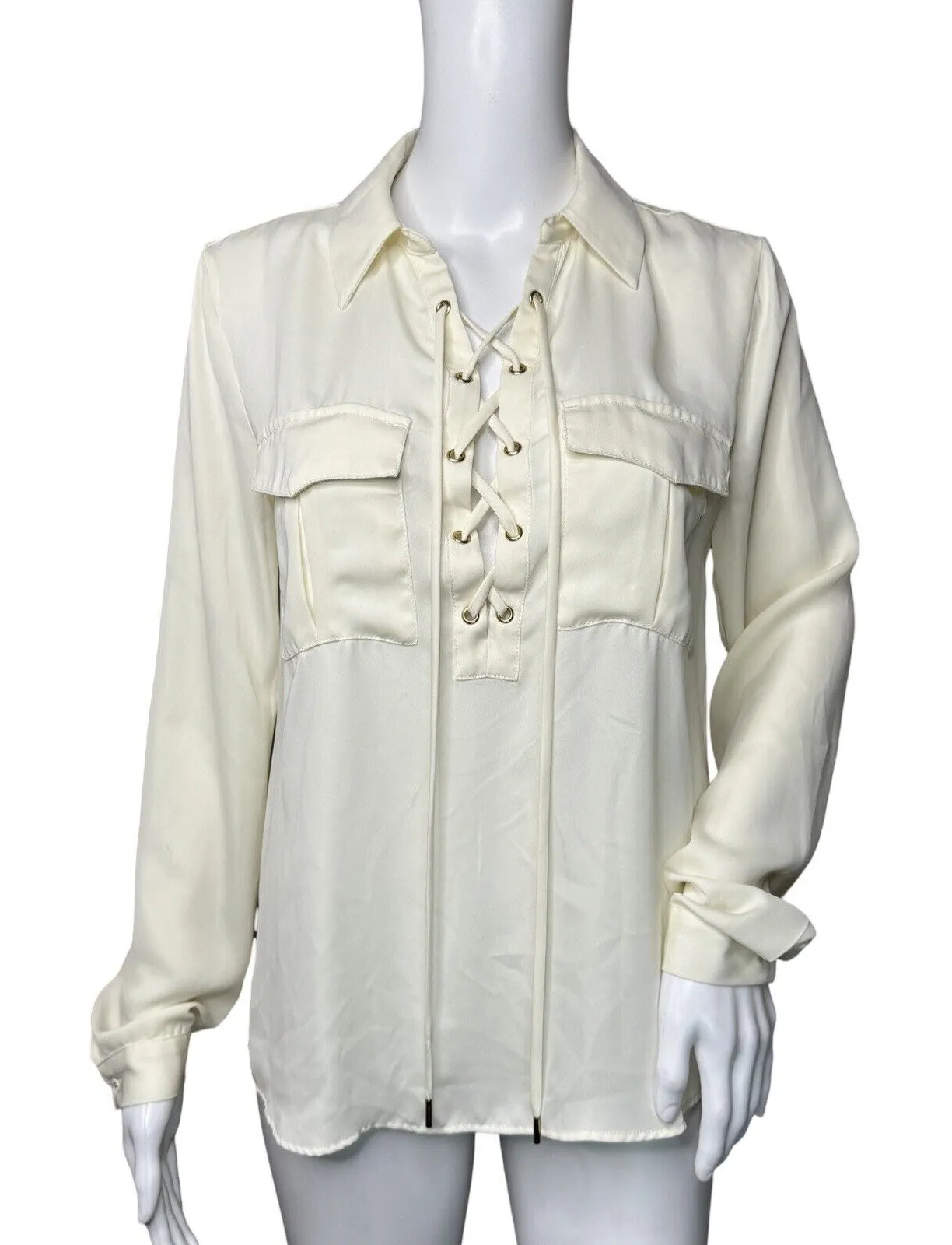 L'Academie Shirt Womens XS Cream Lace Up Blouse The Safari Neutral Minimalist Women's Size XS Extra Small V-Neck Long Sleeve Lace Up Neckline Popover Point Collar Cargo Chest Pockets 100% Polyester Updated Basic Breezy Measurements are Approximate: Length 23" to 27" Armpit to Armpit 18" Gently Used Condition. No Rips Tears or Stains (Q9)