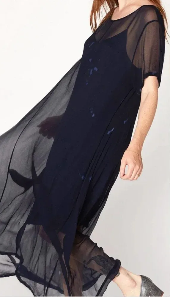 Lacausa Factory Dress in Luna Wash Navy Blue A remix of the classic Factory Dress, this time in Pleated Chiffon. Cut in a simple, swingy silhouette, short sleeves, and pockets, this dress can easily be dressed up or down. Sheer Oversized fit Navy blue with lighter blue splatter design Size US XS 100% viscose Armpit to armpit is approx 24" Hip is approx 35" Length is approx 50"