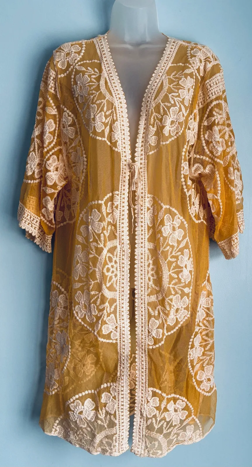 NWT Ana & Rose Lace Kimono Cardigan Color: Mustard and cream Size: Women's Large Ties in the front and goes past the knees, loose fit. This is such a beautiful bohemian style piece. See pictures. Smoke free home. Bundle and save!