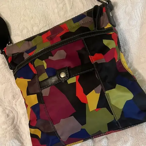 Multi colored Crossbody purse with adjustable strap. Has 2 outer pockets and a zip close pocket on i... Show more