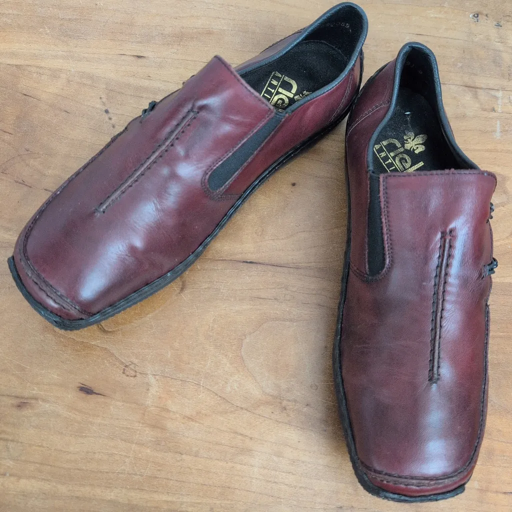 Ladies' Rieker Comfort Flats with dark red leather uppers, elastic sections and a leather lining. SIZE EU 38(their size chart calls this a US 7-7.5) Good Condition with no issues.