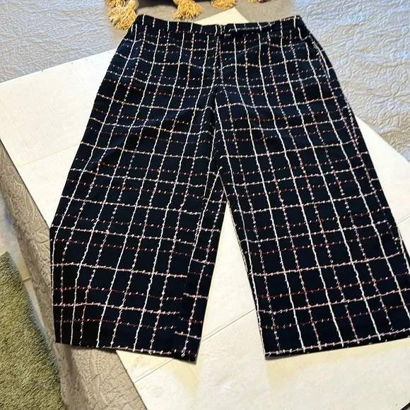 Ladies Sz 12 palooza leg style pants by Alfani. Zips up front they are black with little line of pink. , mauve and white. Inseam measures 23 inches long. They are a blend of polyester and spandex. Worn one time. Like new condition