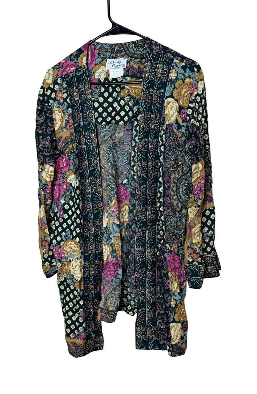 A women's patchwork duster featuring a vibrant floral and paisley print. This open-front cardigan showcases a unique blend of patterns with a dark green base, accented by bold pink, yellow, and blue floral motifs, intricate paisley designs, and a geometric diamond pattern. Measurements: • Chest: 22 in • Length: 31 in • Sleeve Length: 27 in Department: Women Style: Kimono Material: Rayon, Acetate, Nylon Neckline: Open Neck Sleeve Length: Long Sleeve Sleeve Type: Kimono Sleeve Pattern: Floral Theme: Retro, Art Features: Open Fit: Relaxed Occasion: Casual, Party/Cocktail Closure: Open Front Season: All Keywords: kimono, duster, patchwork, floral, paisley, bohemian, vintage, lightweight, open front, long sleeve, multicolor, artsy !!!Please See Measurements vintage sizes run smaller than modern sizes!!!