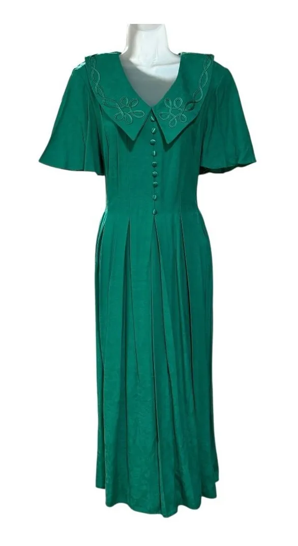 Emerald green midi dress from Lady Dorby featuring a subtle floral jacquard texture. This elegant dress showcases a distinctive Peter Pan collar with decorative embroidery and a flattering V-neckline accented by a row of matching green button closures down the front. The short cap sleeves add a touch of vintage charm, while the fitted waist is accentuated by a self-tie sash at the back. The skirt is designed with sophisticated pleating, creating a graceful silhouette. A concealed zipper closure is located at the back. Keywords: vintage dress, emerald green, floral jacquard, midi dress, Peter Pan collar, embroidered collar, pleated skirt, plus size, women's fashion, retro style, elegant dress, button front, cap sleeve