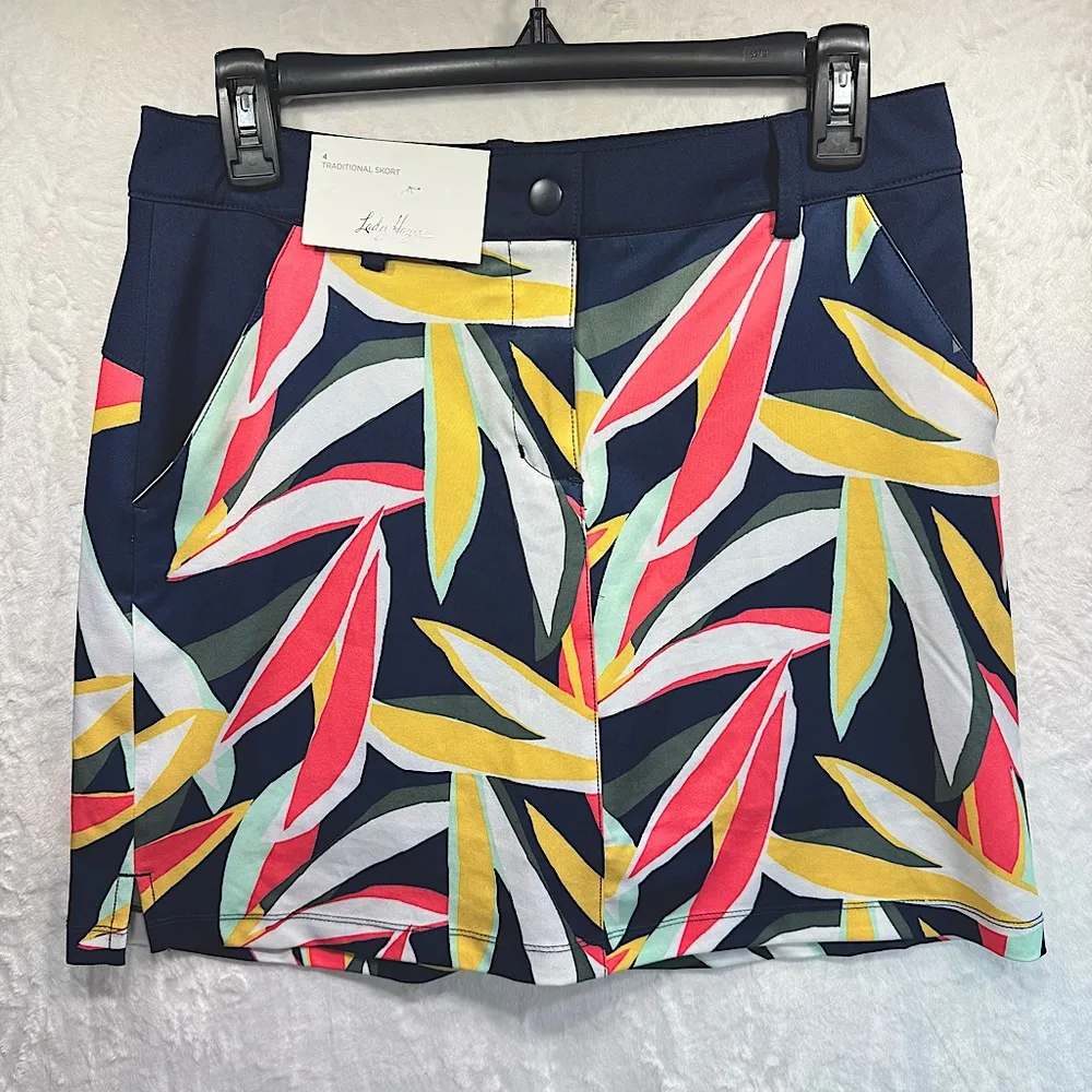 Lady Hagen Desert Getaway 17” Golf Skort in retro leaf dark navy. Moisture Wicking, Wrinkle Resistant, breathable fabric travels well! Pockets, button zip fly, belt loops. Women’s size 4 Brand new with tags. Clean, smoke free home and studio. Five Star Seller. Super fast shipping! Measurements: 15” waist 17” length. *measurements are approximate. Athleisure, athletic, sporty, gym, workout, running, yoga, pilates, hiking, jogging, performance, activewear, loungewear, comfy, stretch, tennis, pickleball SKU# 250560