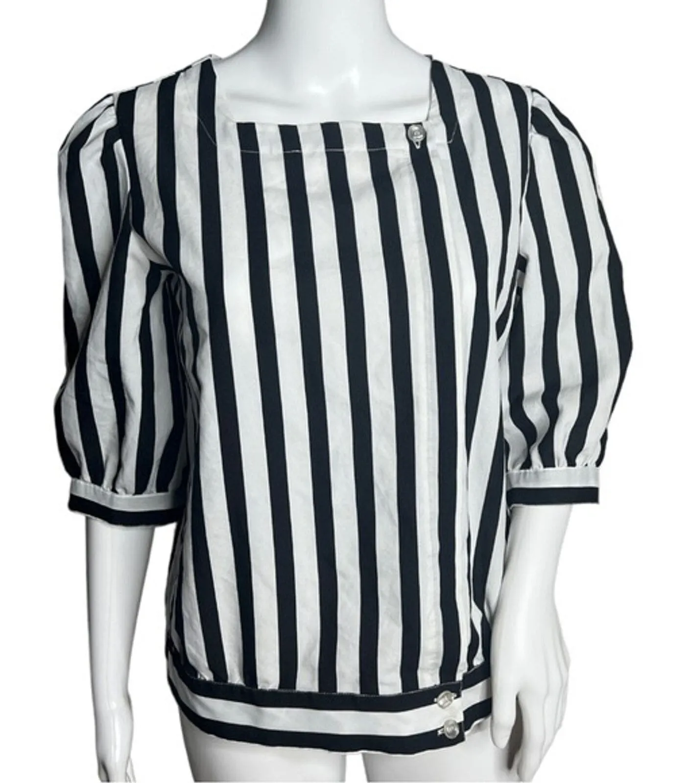 Lady Manhattan Shirt Womens 10 Black White Stripe Blouse Neutral Casual Vintage Women’s Size 10 Off Center Buttons Concealed Button Front Puff Sleeves Elbow Length Banded Hem 100% Polyester Office Party Measurements are Approximate: Length 23” Armpit to Armpit 19” Gently Used Condition. No Rips Tears or Stains (1718)
