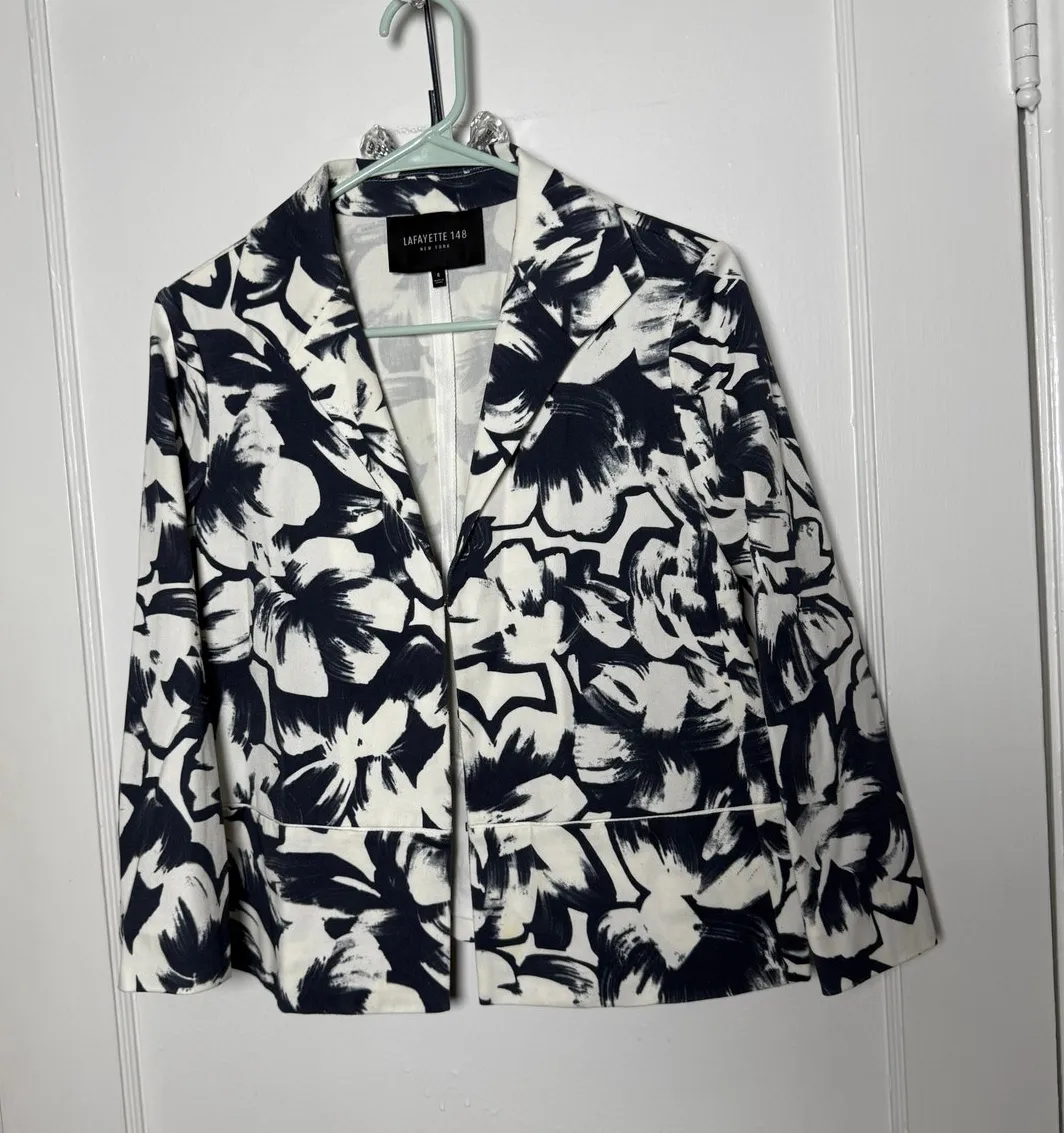 Excellent condition - no snags, holes, or stains Navy blue and white floral statement jacket Blazer style dressy jacket Can easily be dressed up or down Cotton and elastic blend of fabric Smoke free pet friendly home All offers are welcome Ships quick Approximate measurements Pit to pit 19" Length 22" office, work, business, polished, designer, chic, maximalist, patterned
