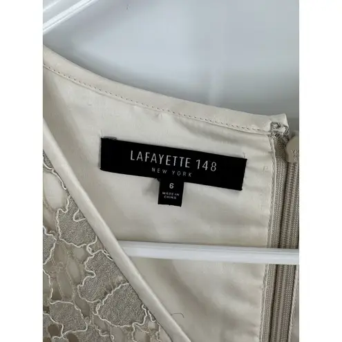 Elevate your wardrobe with this stunning Lafayette 148 New York dress. The perfect blend of elegance and comfort, this fit and flare dress features a beautiful lace overlay in a bone cream color. The knee-length dress has a sleeveless design and a flattering V-neckline that compliments the overall style. Crafted from high-quality lace fabric, this dress is perfect for any occasion, be it a party or a formal event. The dress is available in size 6 and is true to size. The beige color is versatile and easy to style, while the intricate lace detailing adds a touch of sophistication. Add this beautiful dress to your collection today! 18 1/2 inches across chest. B4. 22210
