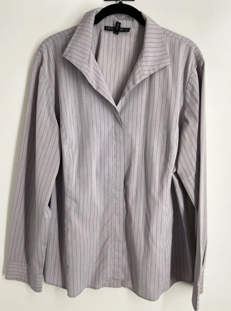 Light purple with stripes in a deeper purple Excellent condition Soft neckline Strategic darts on... Show more