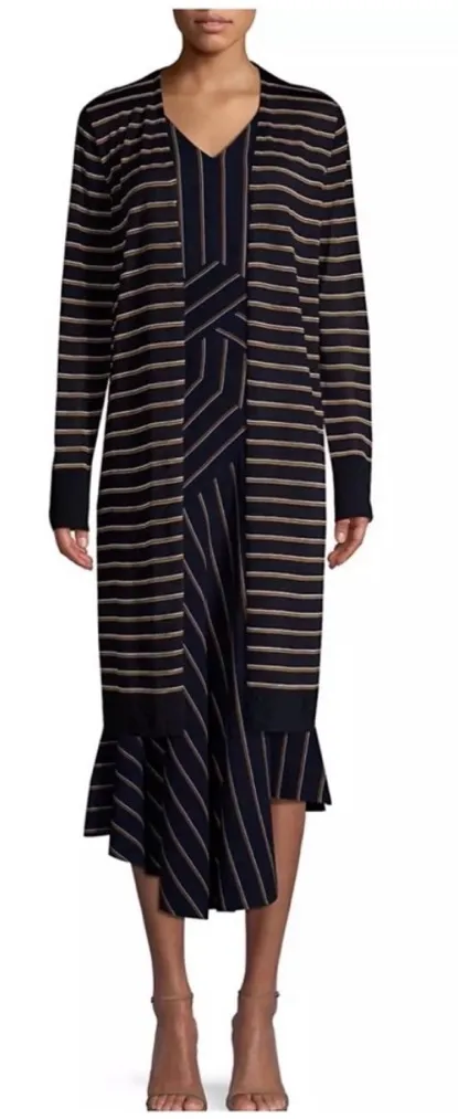 Lafayette 148 Silk Blend Long Sleeve Navy Blue Striped Mid Length Cardigan Designed in a rich navy... Show more
