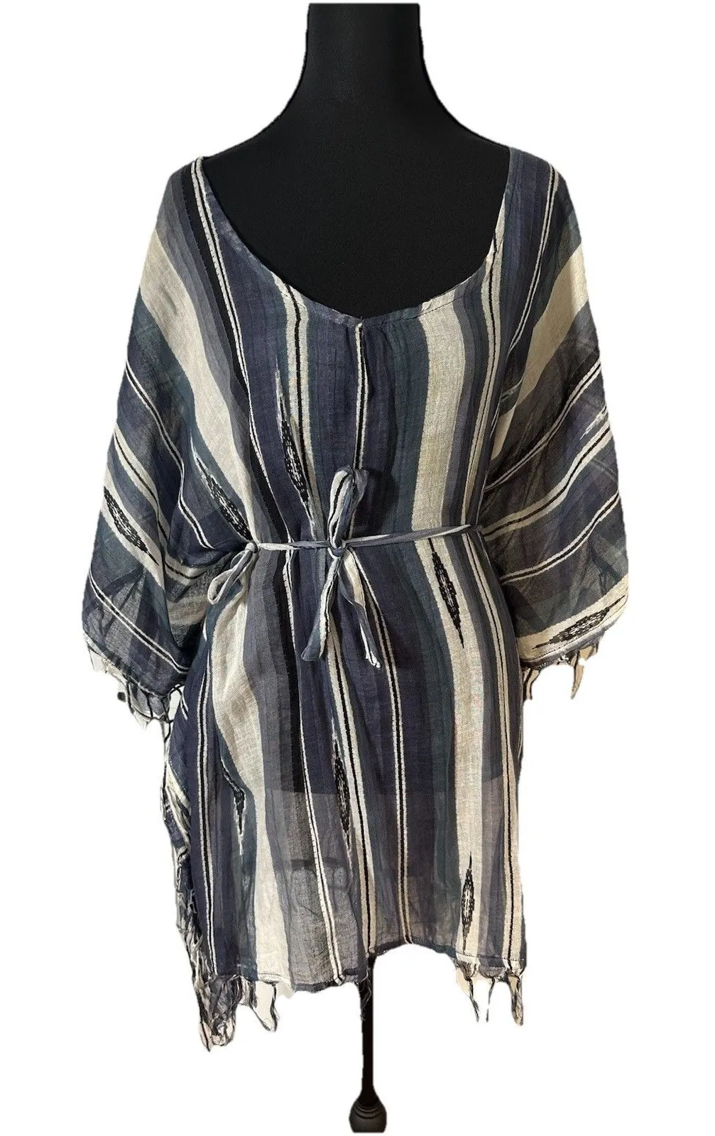 Lagaci Boho Striped Tunic Top Blue White Fringe Hem Peasant Blouse Kimono Sleeve Beach Cover Up cottagecore coastal boho Features: Vertical blue/white stripes Lightweight woven fabric Adjustable tie waist Kimono-style sleeves Raw fringe/tassel hem Slouchy, relaxed fit