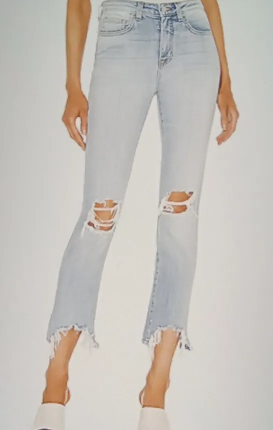 Chic light blue jeans with distressed details. Ankle length with frayed hems. Ideal for casual outin... Show more