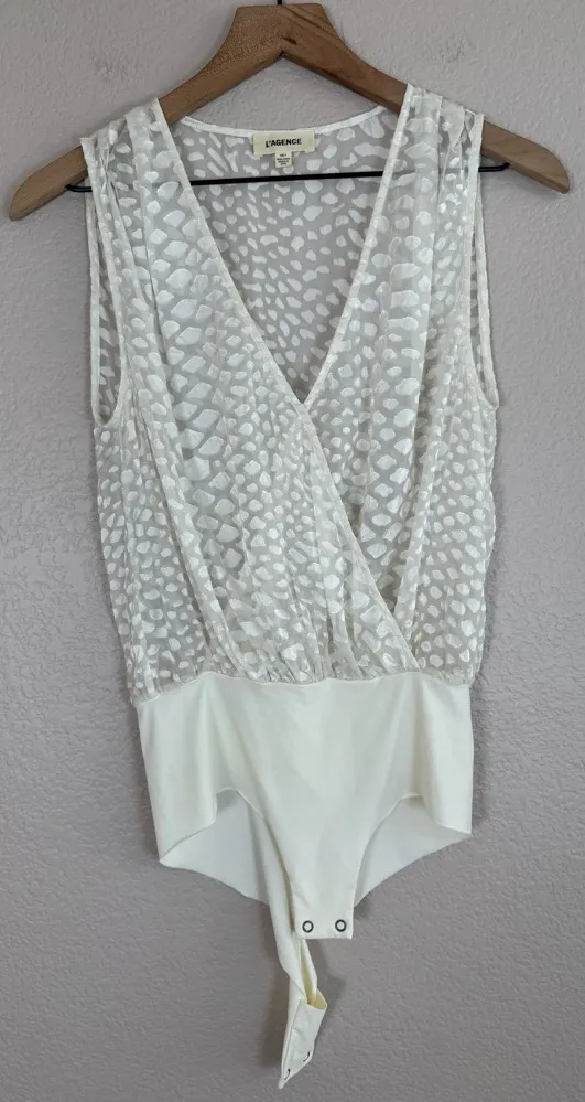 Sexy top girls night out Pair with a blazer, lace bra Leather pants, mini skirt, jeans Dress up or dress down I think it’s the Esme bodysuit Approximate measurements Bust across 16.5” Length 26” Good pre owned condition Faint mark on bodysuit part (pictured) Fabric tag is missing but I believe the material is silk